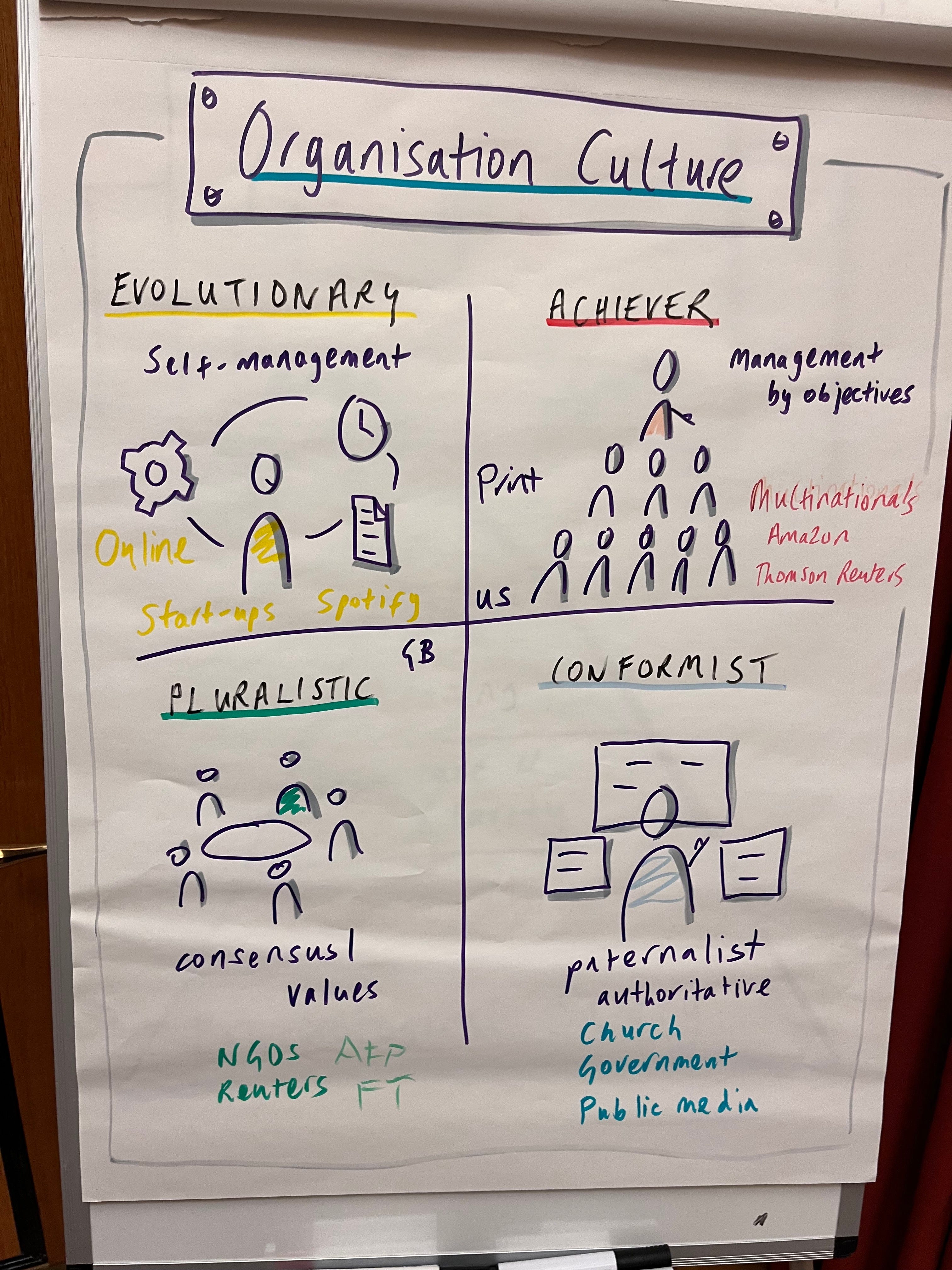 In my courses and consulting, I ask managers to think about what culture is most common at their organisations: leaders at public broadcasters often report having a more top-down conformist style, like other state-run companies. Digital or online departments of big media companies might emulate the self-management of start-ups, while print divisions are often more wedded to a sales-first “achiever” style.